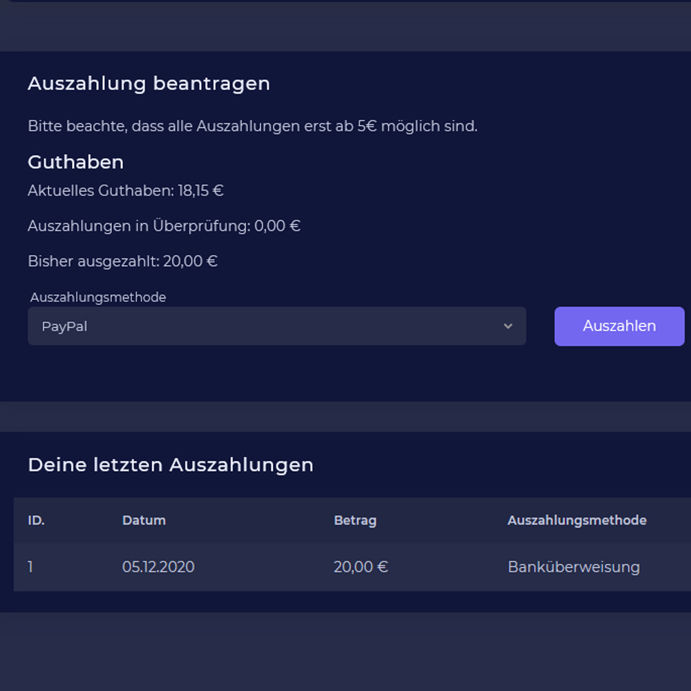 Ihr Guthaben können Sie sich mit wenigen Klicks wöchentlich national und international per PayPal, Amazon oder Banküberweisung auszahlen lassen.